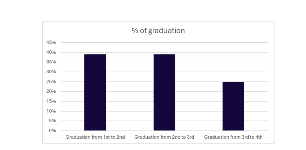 The graph shows a stable or decrease in the frequency of fundraising rounds: 39% of startups graduate from first to second fundraising, 39% from second to third and 25% from third to fourth. At each stage, fewer and fewer startups manage to secure additional funding. It’s not because a startup reach a certain level that the job is done. It’s even the contrary!
