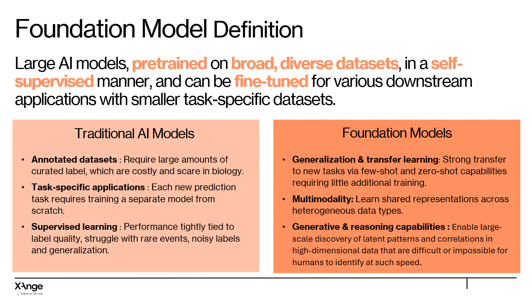 To remind the strict definition of foundation models, such as the one stated above, they are large models pre-trained on vast and diverse biological datasets, using self-supervised learning. Instead of learning a single task, they learn general patterns, and relationships across the vast dataset they are fed, and can later be adapted to many downstream applications using relatively little additional data.