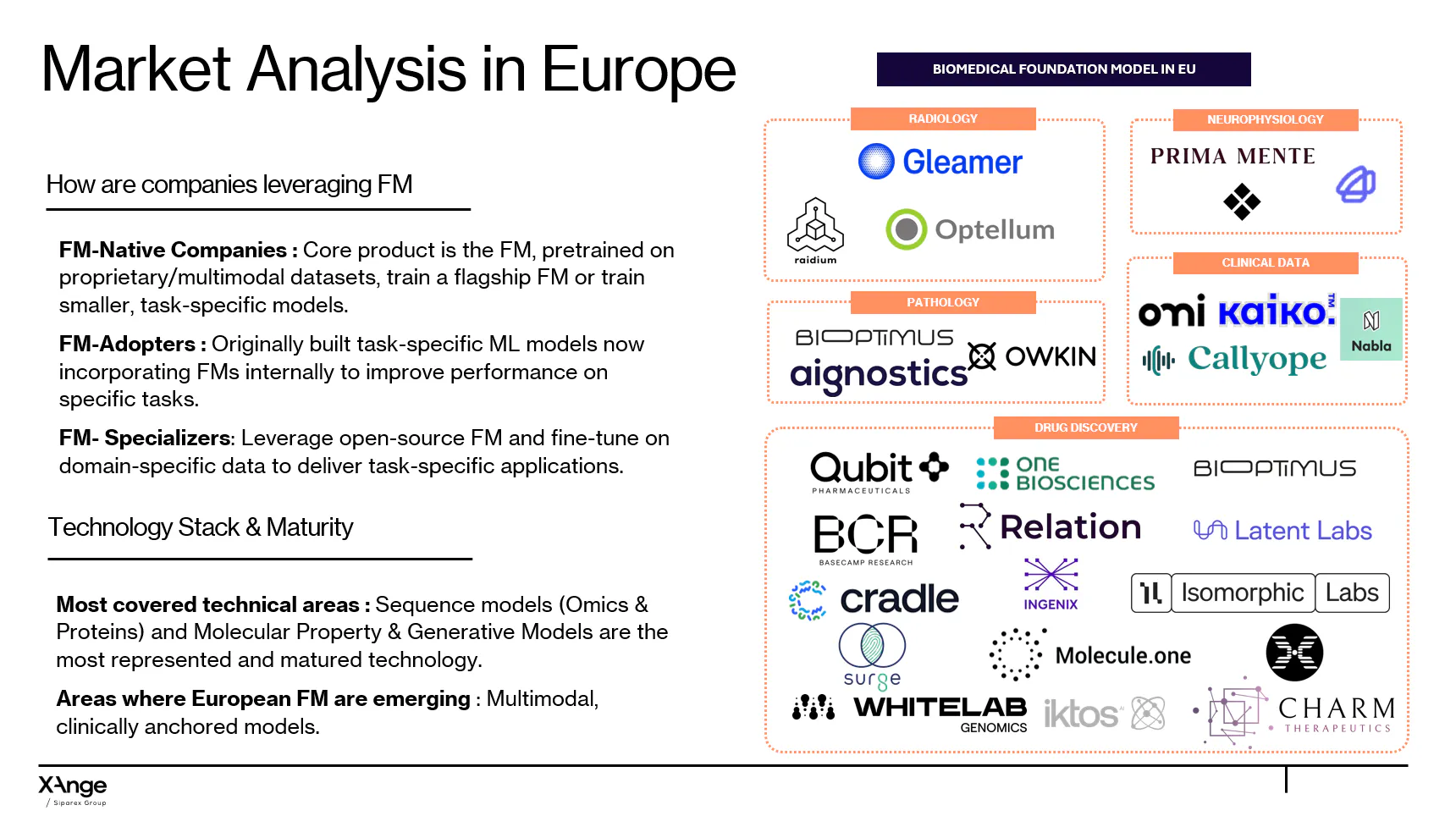 - FM-native companies, such as Bioptimus or Raidium, building large multimodal foundation models as their core product, giving them full control over architecture and data and strong long-term defensibility, but at the cost of heavy capital, compute, and long development cycles.