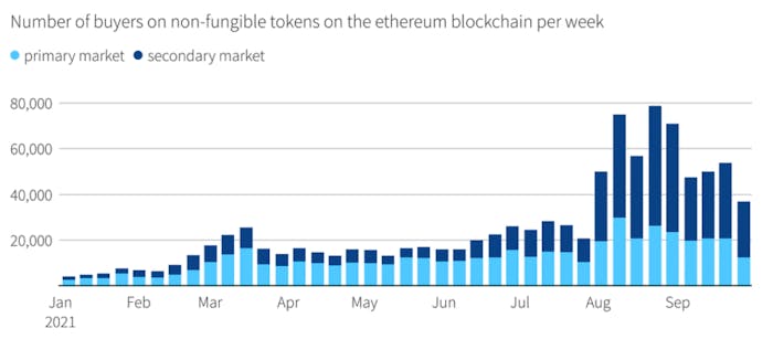 Le nombre d’acheteurs sur le marché secondaire est en augmentation et a même dépassé le nombre d’acheteurs sur le marché primaire depuis le mois d’août 2021. C’est notamment ce qui explique l’augmentation du volume de ventes visible sur le graphique précédent.